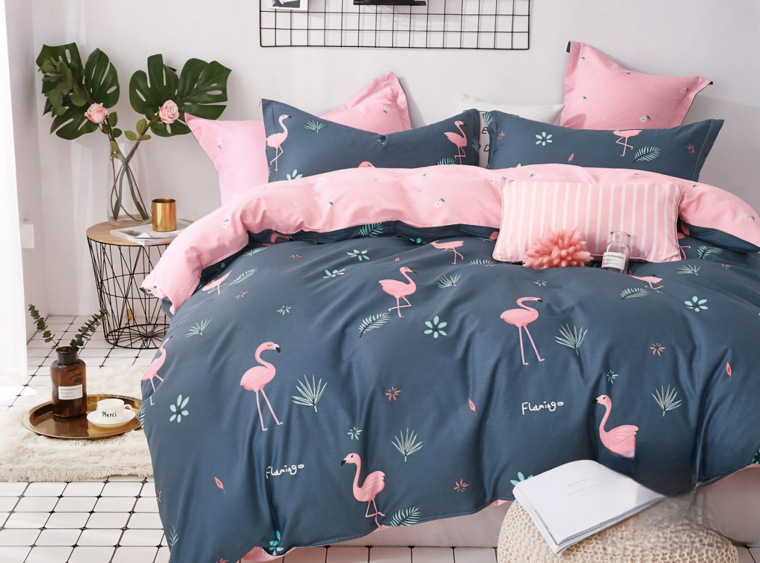 Komplet Pościeli 200×220 cm M1148 Różowe Flamingi i Kwiatowa Noc