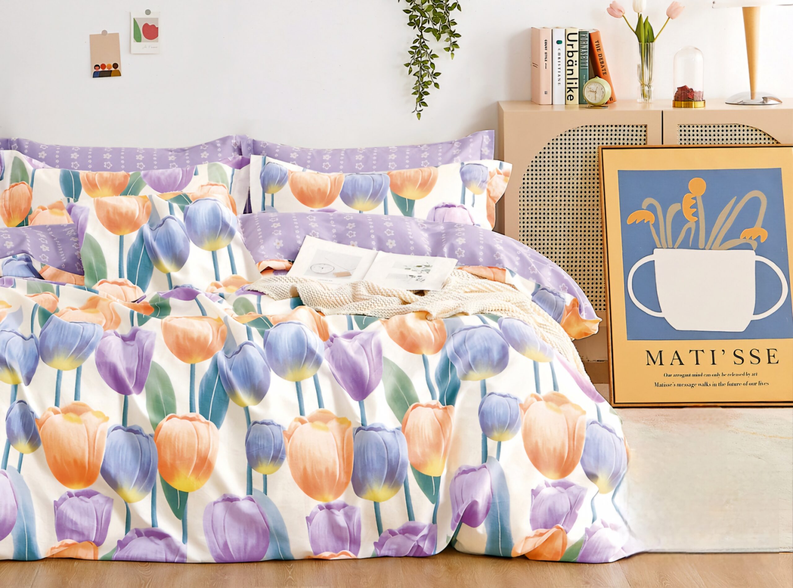 Wprowadź do swojej sypialni powiew świeżości z kompletem pościeli „Kwiatowy Świt”. Delikatny motyw tulipanów w pastelowych barwach na białym tle, wykończony subtelną lawendową ramką, tworzy atmosferę harmonii i spokoju. To idealny wybór dla tych, którzy cenią sobie romantyczne akcenty i naturalne piękno w aranżacji wnętrz.